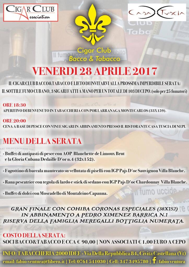 Inizia, finalmente, la bella stagione e il Cigar Club Bacco&Tabacco, prende la palla al balzo per incrementare le occasioni “fumose”, dopo i primi 2 interessanti eventi rispettivamente con il Clandestino della Nostrano del Brenta ed il sigaro Amerigo, entrambi in anteprima, la macchina organizzativa si mette a pieno regime , ed il club con il suo fondamentale zoccolo duro , decide per un grande evento senza precedenti.
