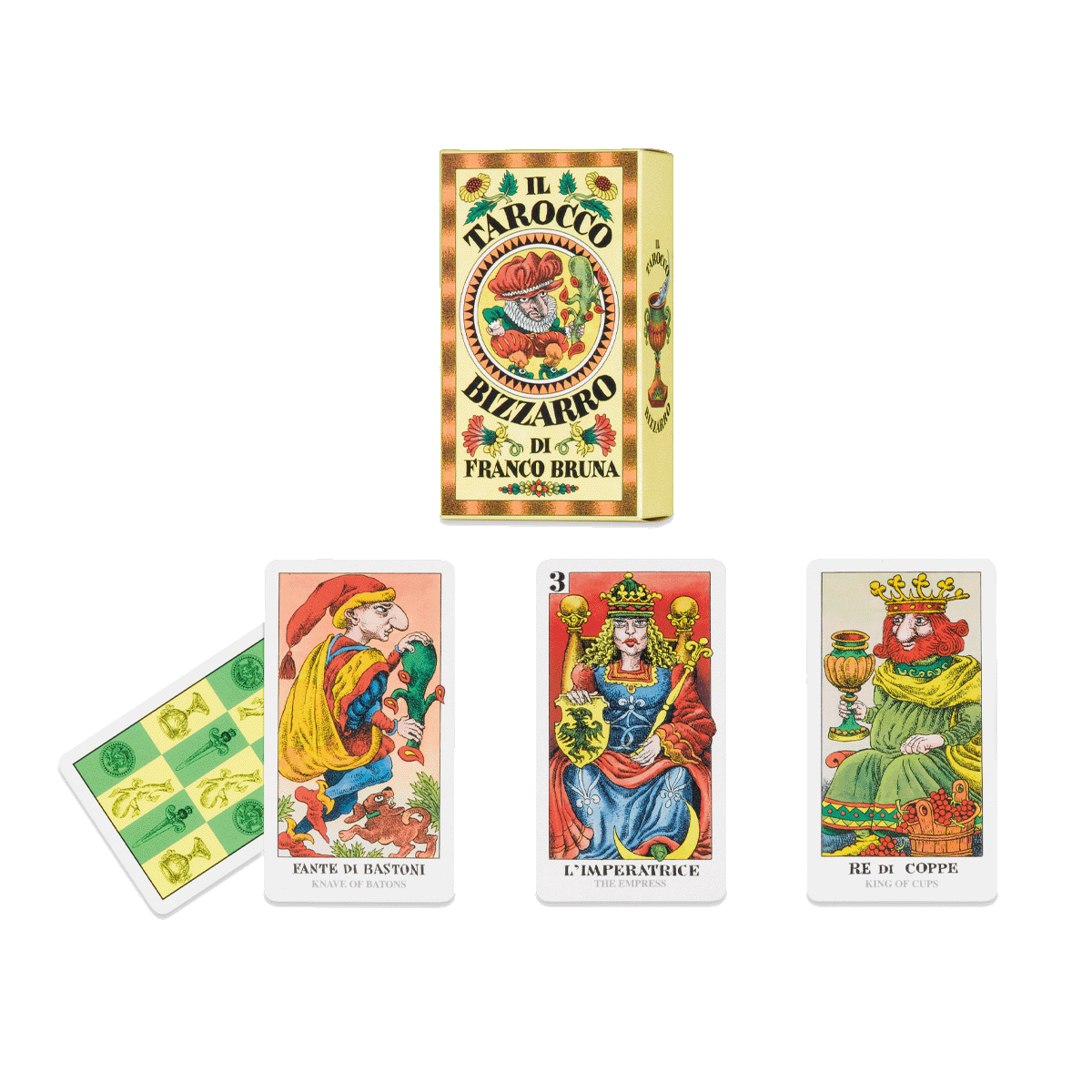 Il Tarocco Bizzarro di Franco Bruna nasce dal desiderio dell’autore di smitizzare, con pacata ironia, la simbologia classica del Tarocco Piemontese. Formato mm 66×118, composto da 78 carte (22 Arcani maggiori e 56 Arcani minori) con libretto in italiano e inglese.