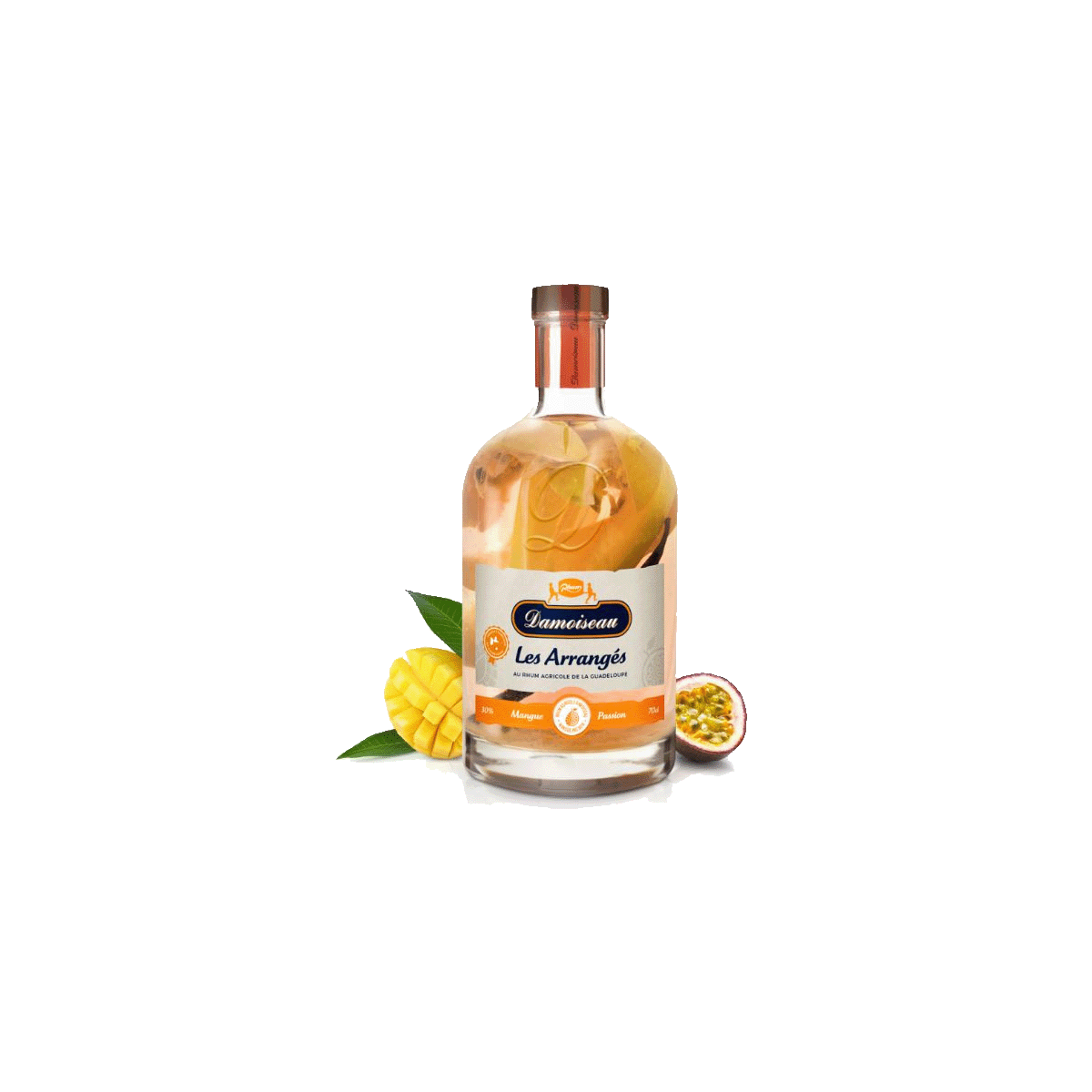 Con passione Damoiseau ha sviluppato questo rhum arrange al mango e al maracuja. La frutta fresca viene tagliata e messa istantamente nelle bottiglie pezzo per pezzo. Dopodichè viene aggiunto il rhum agricolo bianco Damoiseau. Una macerazione curata ne fa un prodotto particolarmente saporito.