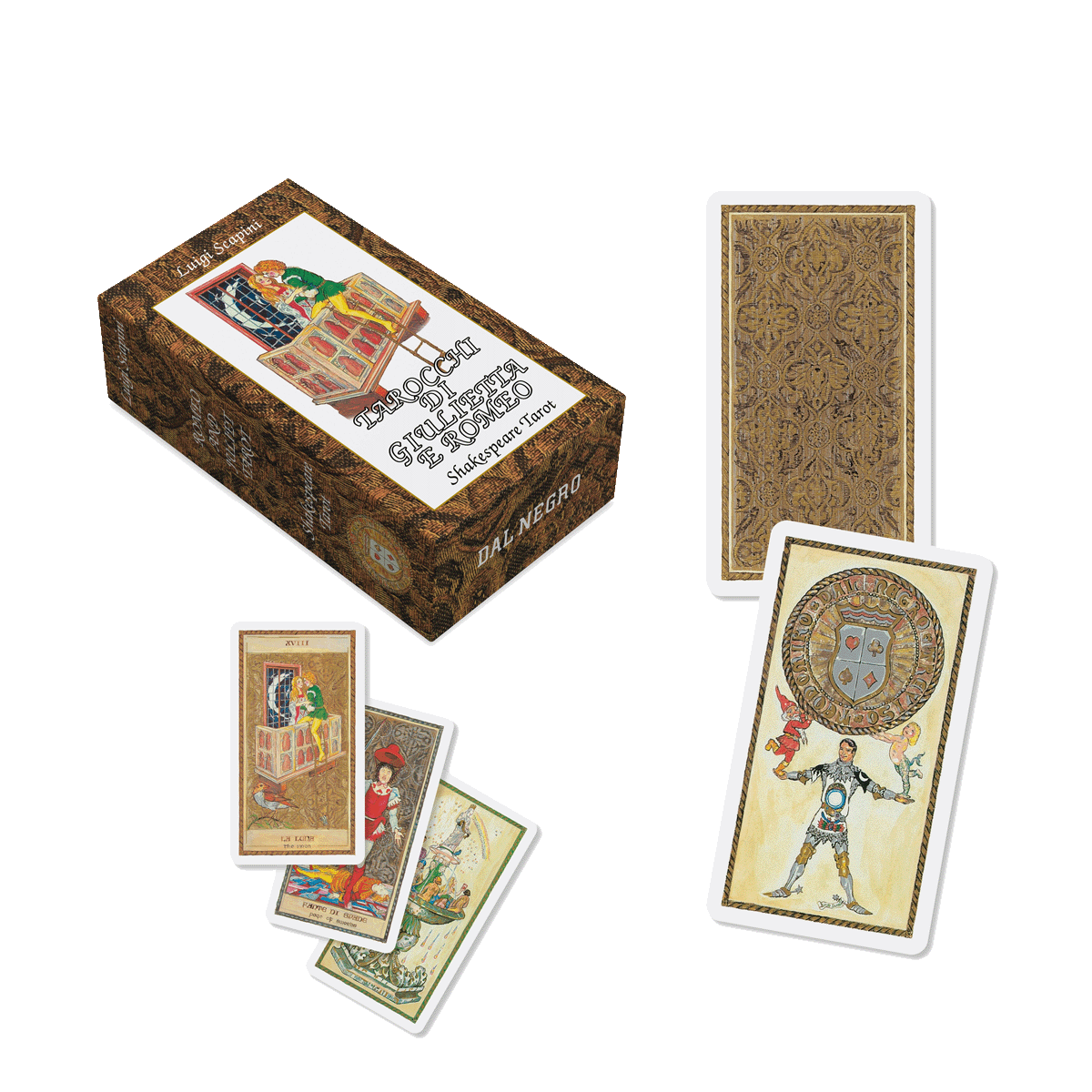 I Tarocchi di Giulietta e Romeo – Shakespeare Tarot si compongono di 78 carte (22 Arcani maggiori e 56 Arcani minori) formato mm 66×119. Disegni e libretto a cura di L. Scapini, in italiano e inglese.