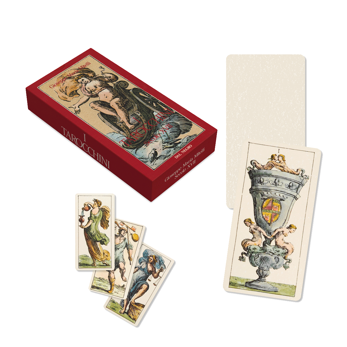 I Tarocchini di G. M. Mitelli sono composti da 62 carte, formato mm 72×140. Disegni di G.M. Mitelli acquarellati da C. Pipoli, testo a cura di G. Mandel. Libretto in italiano.