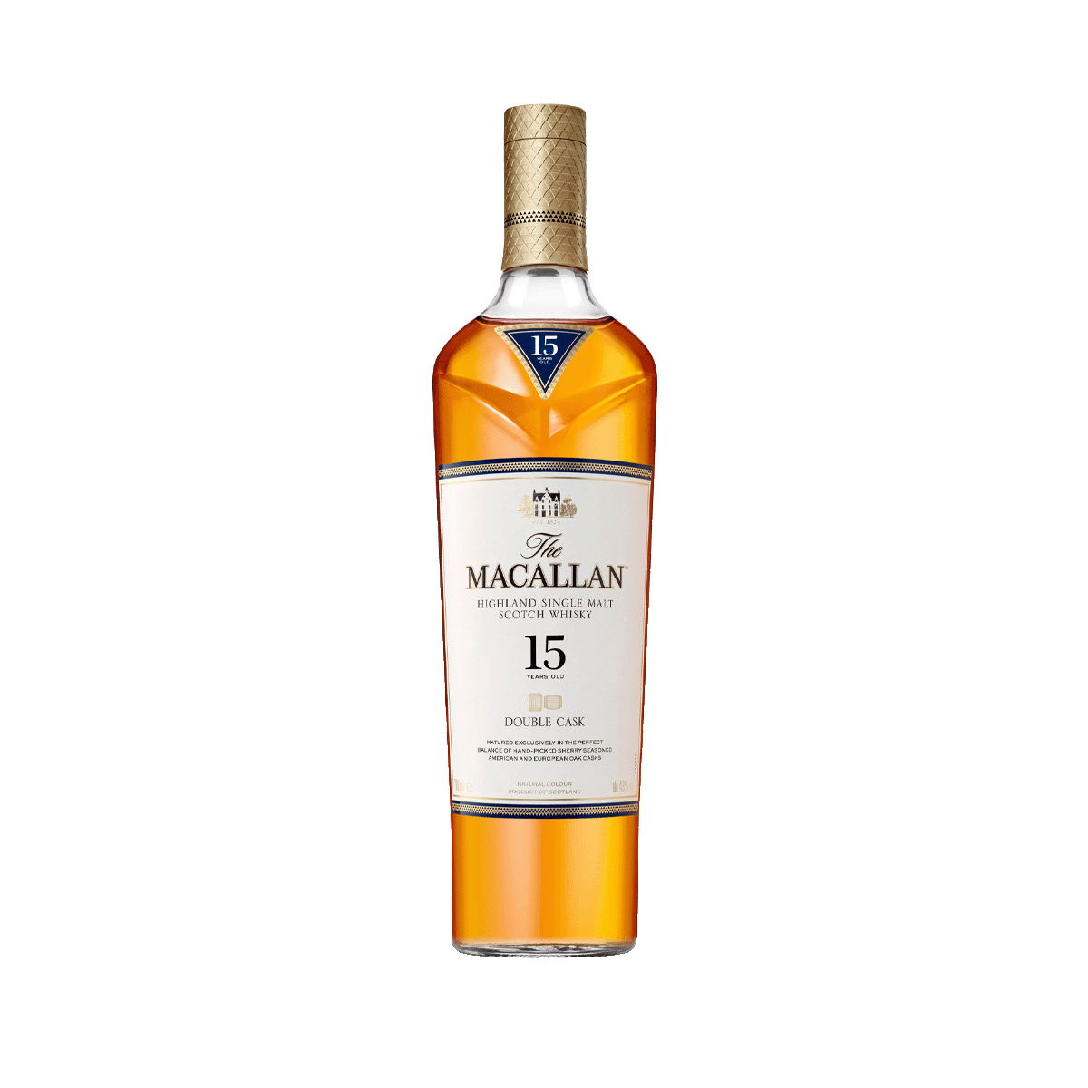 Macallan 15 .Y.O double cask è un whisky Invecchiato in un misto di botti di rovere americano ed europeo, poi unite in botti ex-sherry Oloroso. Il profilo fruttato e agrumato del 15 anni lascia spazio a una complessità crescente, note di frutta sotto spirito e spezie sul finale.